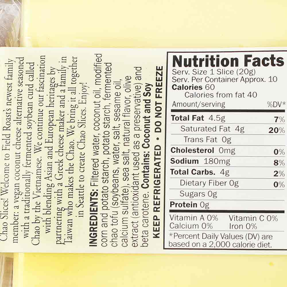 Field Roast - Chao Vegan Cheese Slice - Creamy Original calories carbs nutrition facts MyFitnessPal Field Roast Field Roast - Chao Vegan Cheese Slice - Creamy Original. Ingredients Filtered Water Coconut Oil Modified Corn and Potato Starch Potato Starch Fermented Chao Tofu Soybeans Water Salt Sesame Oil. 000g Nutrition Facts - Similar.