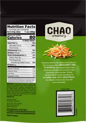. Chao cheese is a vegan cheese alternative made from a blend of coconut oil and modified starch. 1997 - Seattle WA. 1 slice 20 g Amount Per Serving.